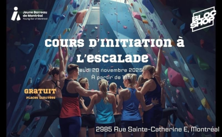 Le Jeune Barreau de Montréal vous offre un cours d’initiation à l’escalade entièrement...