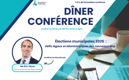 Le Jeune Barreau de Montréal vous invite à son prochain dîner-conférence, qui se tiendra...
